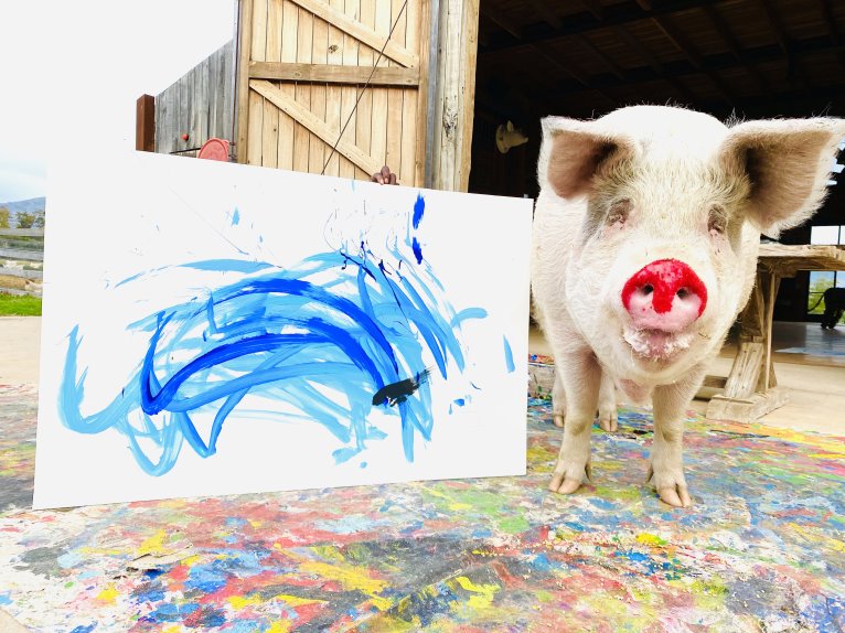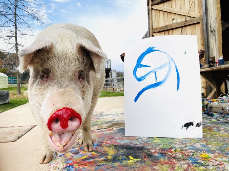 Durch den Kauf eines Bildes des berühmten malenden Schweines „Pigcasso“ fördern auch Sie die Arbeit der Farm.