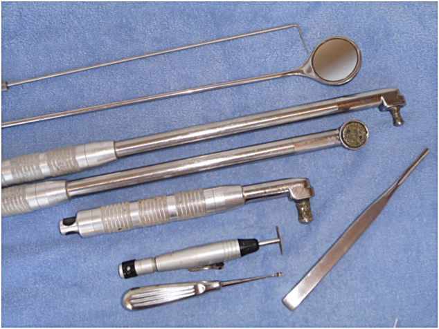 Von oben nach unten: Zahnsonde, Zahnspiegel, Apple Core, Big John, Apple Core-kurz, Trennscheibe, Scharfer Löffel und Hohlmeißel